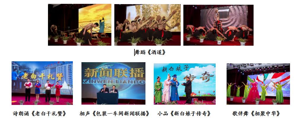 公司舞蹈隊帶來的舞蹈《酒道》,以逼真的表演將老白干酒文化呈現(xiàn)給觀眾,更把我們老白干精湛的釀酒技藝用肢體語言演繹的惟妙惟肖。詩朗誦《老白干禮贊》,高度贊揚了衡水老白干建廠七十周年,一代代老白干人一路走來披荊斬棘,繼承傳統(tǒng)、開拓創(chuàng)新,譜寫成老白干最響亮的贊歌。營銷公司崔艷芳、劉康康帶來的小品《新白娘子傳奇》,搞笑滑稽的動作,奪人眼球,令觀眾拍手叫好。包裝一車間袁文興、貢愛華帶來的相聲《包裝一車間新聞聯(lián)播》,以幽默的語言,夸張的表情,使現(xiàn)場氣氛異常活躍。最后,技術(shù)中心皮寒玉帶來歌伴舞《相聚中華》,聯(lián)歡會在最強音的旋律中圓滿結(jié)束。